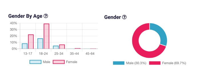 Billies main genre of music is Pop and her main targeted audience is young adults. In terms of the demographic of the audience, 65% female and 35% male. Furthermore, about 75% of her audience are 34 years old or younger. Nearly 70% of her audience are females which is a huge comparison compared to the 30% of males.