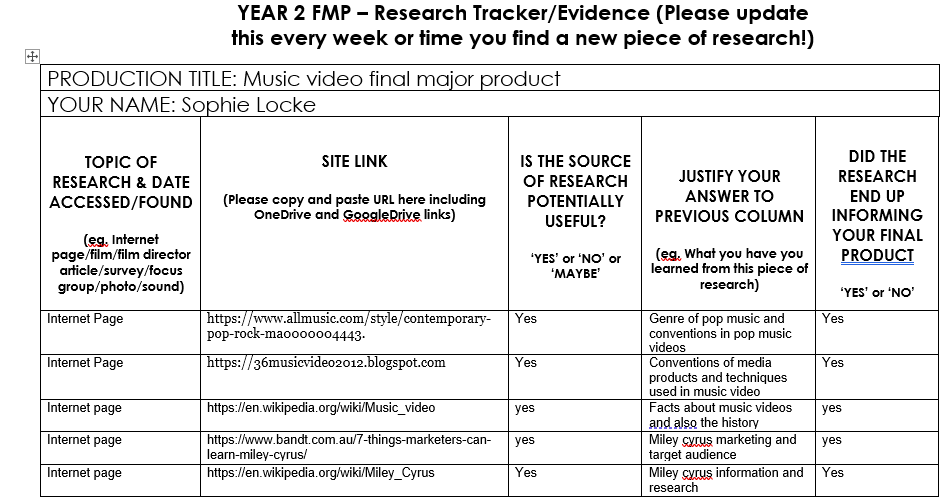 In conclusion this research has really helped me understand similar style music videos to the one I would like to create. This has given me more inspiration about the look of my video since watching Avril Laenges and Mileys videos. After researching about the music videos it has really helped me decide on the style I want my actor to have to match the aesthetic of the song. I created a research tracker to show all the topics and site links that I used when getting my Research. This is to prove where the research has come from and what we learned from that research.
